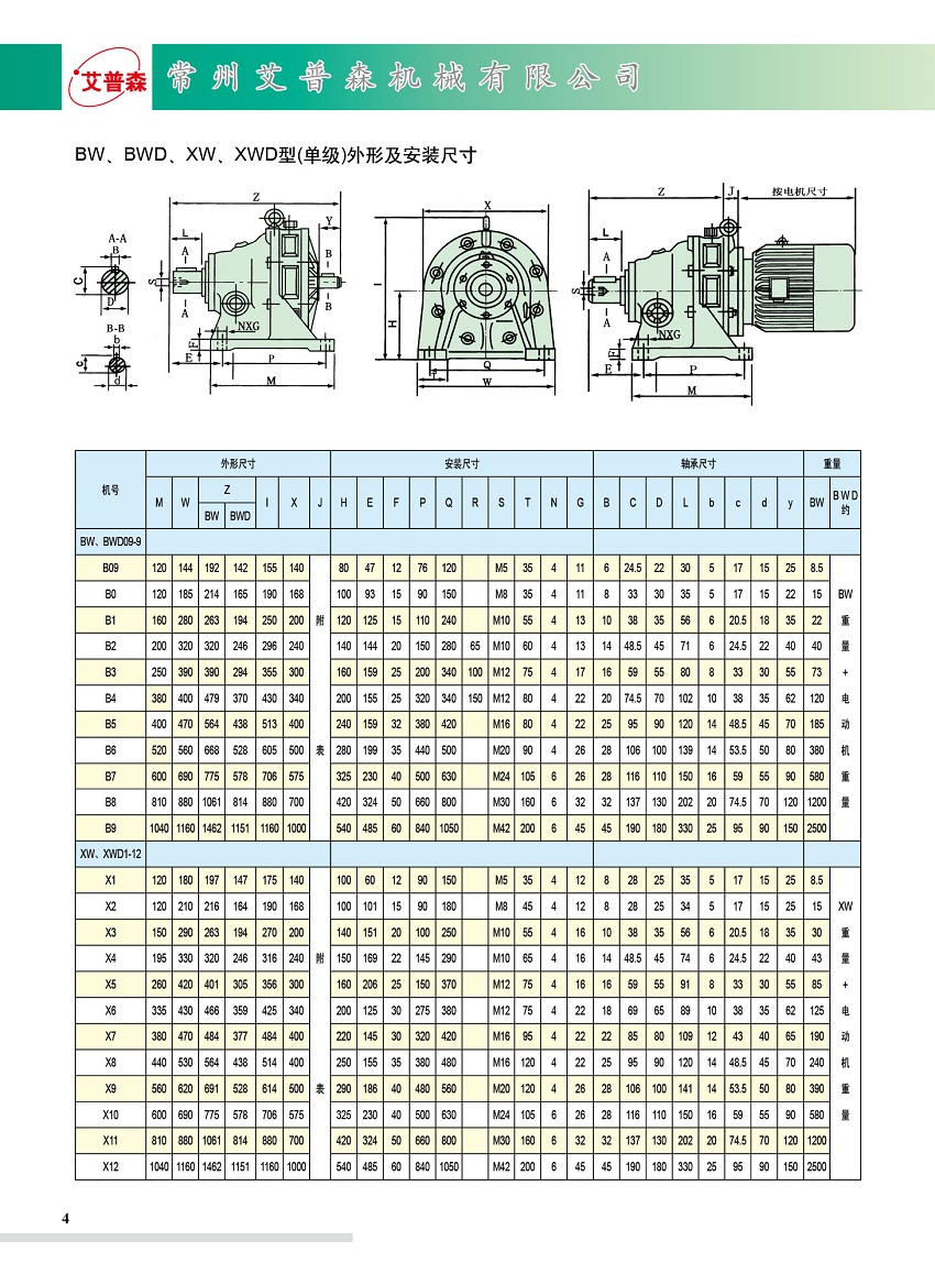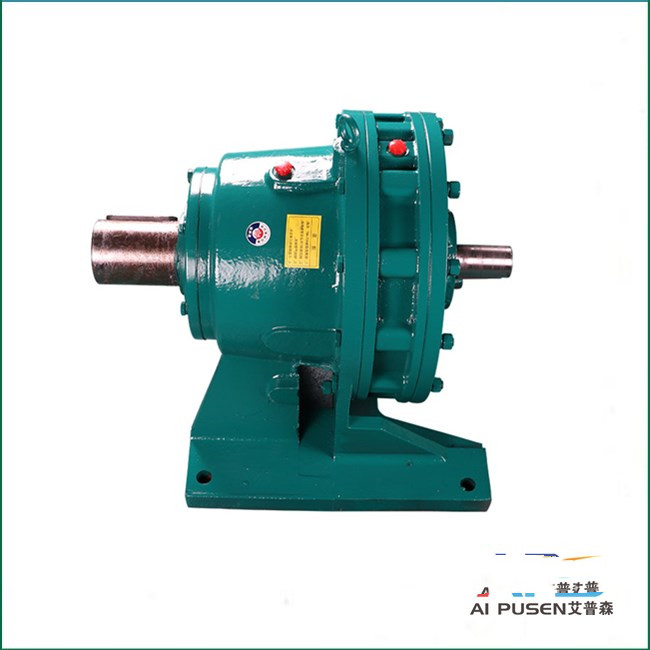 BW型臥式雙軸型擺線針輪減速機(jī) 第一、總述: 擺線針輪減速機(jī)全部傳動(dòng)裝置可分為三部分:輸入部分、減速部分、輸出部分。在輸入軸上裝有一個(gè)錯(cuò)位180的雙偏心套,在偏心套上裝有兩個(gè)稱為轉(zhuǎn)臂的滾柱軸承,形成H機(jī)構(gòu)、兩個(gè)擺線輪的中心孔即為偏心套上轉(zhuǎn)臂軸承的滾道,并由擺線輪與針齒輪上一組環(huán)形排列的針齒相嚙合,以組成齒差為一齒的內(nèi)嚙合減速機(jī)構(gòu),(為了減小摩擦,在速比小的減速機(jī)中,針齒上帶有針齒套)。當(dāng)輸入軸帶著偏心套轉(zhuǎn)動(dòng)一周時(shí),由于擺線輪上齒廓曲線的特點(diǎn)及其受針齒輪上針齒限制之故,擺線輪的運(yùn)動(dòng)成為既有公轉(zhuǎn)又有自轉(zhuǎn)的平面運(yùn)動(dòng),在輸入軸正轉(zhuǎn)周時(shí),偏心套亦轉(zhuǎn)動(dòng)一周,擺線輪于相反方向轉(zhuǎn)過一個(gè)齒從而得到減速,再借助W輸出機(jī)構(gòu),將擺線輪的低速自轉(zhuǎn)運(yùn)動(dòng)通過銷軸,傳遞給輸出軸,從而獲得較低的輸出轉(zhuǎn)速。 第二、擺線針輪減速機(jī)特點(diǎn): 高速比和高效率單級(jí)傳動(dòng),就能達(dá)到1:87的減速比,效率在90%以上,如果采用多級(jí)傳動(dòng),減速比更大?! 〗Y(jié)構(gòu)緊湊體積小由于采用了行星傳動(dòng)原理,輸入軸輸出軸在同一軸心線上,使其機(jī)型獲得盡可能小的尺寸。 運(yùn)轉(zhuǎn)平穩(wěn)噪聲低擺線針齒嚙合齒數(shù)較多,重疊系數(shù)大以及具有機(jī)件平衡的機(jī)理,使振動(dòng)和嗓聲限制在最小程度。 使用可靠、壽命長因主要零件采用高碳鉻鋼材料,經(jīng)淬火處理(HRC58~62)獲得高強(qiáng)度,并且,部分傳動(dòng)接觸采用了滾動(dòng)摩擦,所以經(jīng)久耐用壽命長。 設(shè)計(jì)合理,維修方便,容易分解安裝,最少零件個(gè)數(shù)以及簡單的潤滑,使擺線針輪齒輪減速機(jī)深受用戶的信賴。