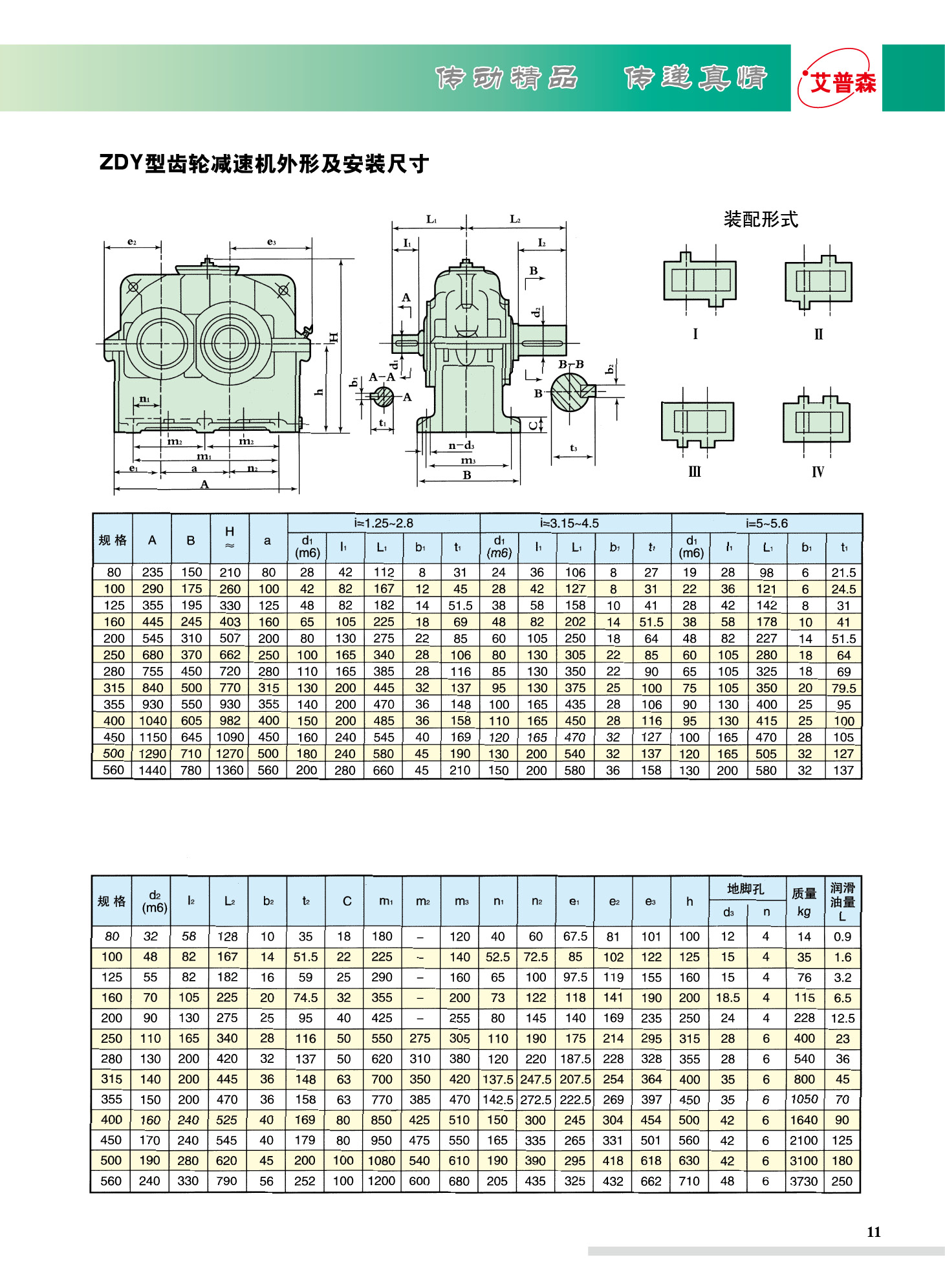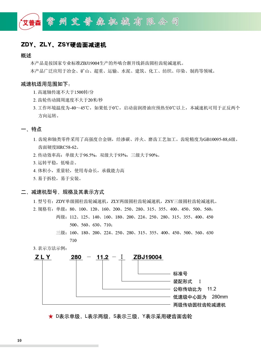 ZDY/ZLY/ZSY圓柱齒輪減速機(jī)減速機(jī)適用范圍如下: 1、高速軸轉(zhuǎn)不大于1500轉(zhuǎn)/分。 2、齒輪傳動(dòng)圓周速度不大于20米/秒。 3、工作環(huán)境溫度為-40~+45℃,如果低于0℃,啟動(dòng)前潤(rùn)滑油應(yīng)預(yù)熱至0℃以上,本減速機(jī)可用于正反兩個(gè)方向運(yùn)轉(zhuǎn)。 一、特點(diǎn) 1.齒輪采用高強(qiáng)度低碳合金鋼經(jīng)滲碳淬火而成,齒面硬度達(dá)HRC58-62,齒輪均采用數(shù)控磨齒工藝,精度高,接觸性好。 2.傳動(dòng)率高:?jiǎn)渭?jí)大于96.5%,雙級(jí)大于93%,三級(jí)大于90%。 3.運(yùn)轉(zhuǎn)平穩(wěn),噪音低。 4.體積小,重量輕,使用壽命長(zhǎng),承載能力高。 5.易于拆檢,易于安裝。 ZSY三級(jí)圓柱齒輪減速機(jī)規(guī)格型號(hào)有:ZSY160.ZSY180.ZSY200.ZSY224.ZSY250.ZSY280.ZSY315.ZSY355. ZSY400.ZSY450.ZSY500.ZSY560.ZSY630.